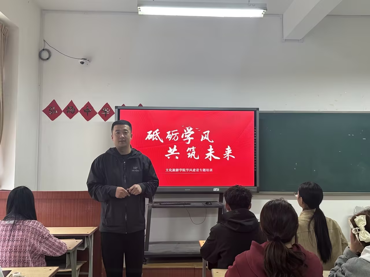 开展“砥砺学风,共筑未来”学生干部专题培训。5月6日下午,文化旅游学院学生党支部组织全体学生干部召开了学风建设专题培训会。培训内容围绕现阶段学院学风建设存在的问题,阐述了优良学风对学生成长成才的重要性,围绕学风建设,对学生干部提出了三点要求:要提升班级管理能力,认真履行学生干部职责,营造积极向上的学习风气;要严于律己、以身作则,从学习态度、行为习惯、仪容仪表等方面发挥“领头雁”作用;要提升工作执行力,确保学院学风建设措施落实到位。