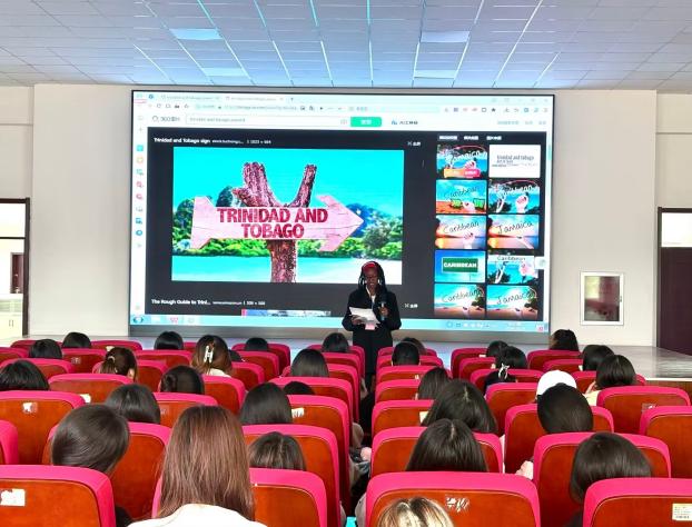 接下来,四位外国教师为文化旅游学院师生们带来了一场以“跨山越海,以艺通心”为主题的专题讲座。学生们积极参与,现场气氛热烈。四位特多教师以精炼而有趣的自我介绍打破了与学生之间的陌生感,迅速拉近了彼此的距离。在随后的分享中,他们详细介绍了特多文化特色和丰富多彩的服饰,让同学们对特多有了更深入的了解。此外,特多教师还带来了特多的传统美食,让师生们品尝到了异国风味。