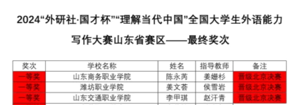 本站讯 10月27日,2024年“外研社·国才杯”理解当代中国全国大学生外语能力写作大赛(山东赛区)比赛在线上举办。我校文化旅游学院姜姗杉老师指导的陈永芮同学斩获山东赛区一等奖第一名的好成绩,成功晋级国赛。