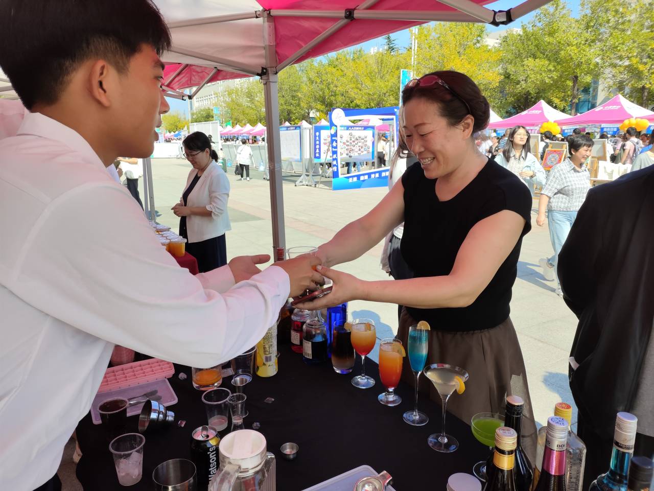 特色展示,营造氛围。文化旅游学院在迎新现场布置“七彩学院·七彩人生”主题美陈,充分展示专业特色,开展特色调酒、茶艺表演,陈列学前教育手工展,突出了对文旅新生“青春作叶 梦想成花”的期许。报到现场,新生和家长们纷纷与迎新画框合照,大家笑容明朗,充满了对大学生活的憧憬,对新的追梦旅程的期待与向往。TS调酒与茶礼社的精彩表现引得大家纷纷驻足围观,学前教育的手工体验,让家长和孩子共度了一段美好时光。