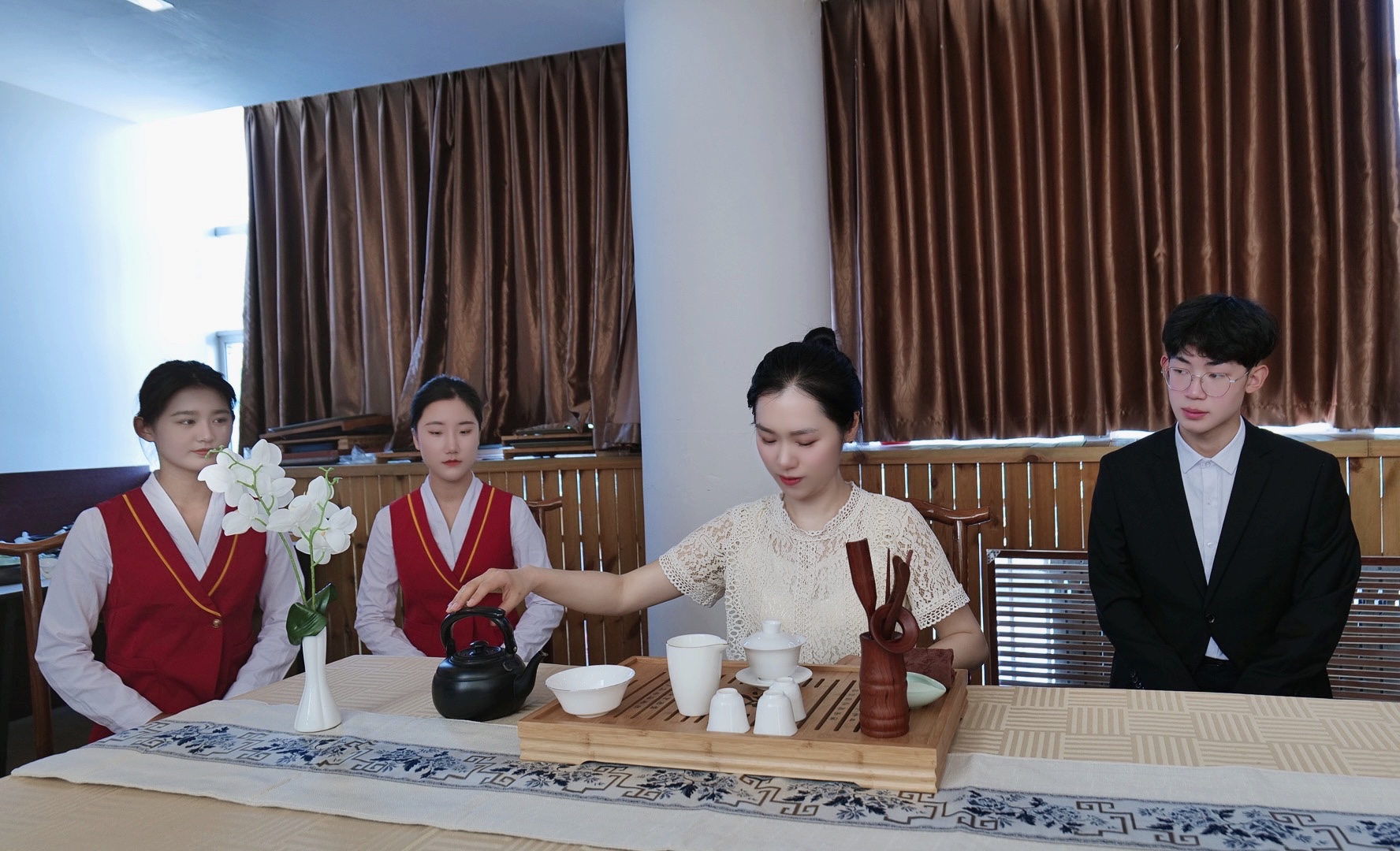 本站讯 为弘扬传统文化,展示技能风采,5月15日,文化旅游学院在传统文化实训室举办了“茶和天下共享非遗”茶香满校园的职教周特别活动。2021级、2022级酒店管理与数字化运营专业的全体同学积极响应,师生们品茶、论茶、切磋茶艺,茶香溢满校园。
