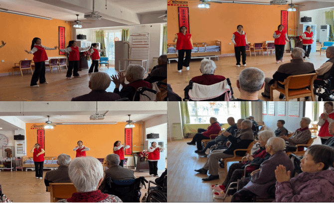 与此同时,社团实践部的同学们为老人们准备了一场精彩的舞蹈演出。随着音乐声响起,同学们翩翩起舞,舞姿优美动人,大家还和老人一起合唱了歌曲《洪湖水浪打浪》,同学们的青春活力与热情感染着老人们,赢得了阵阵掌声和喝彩声。