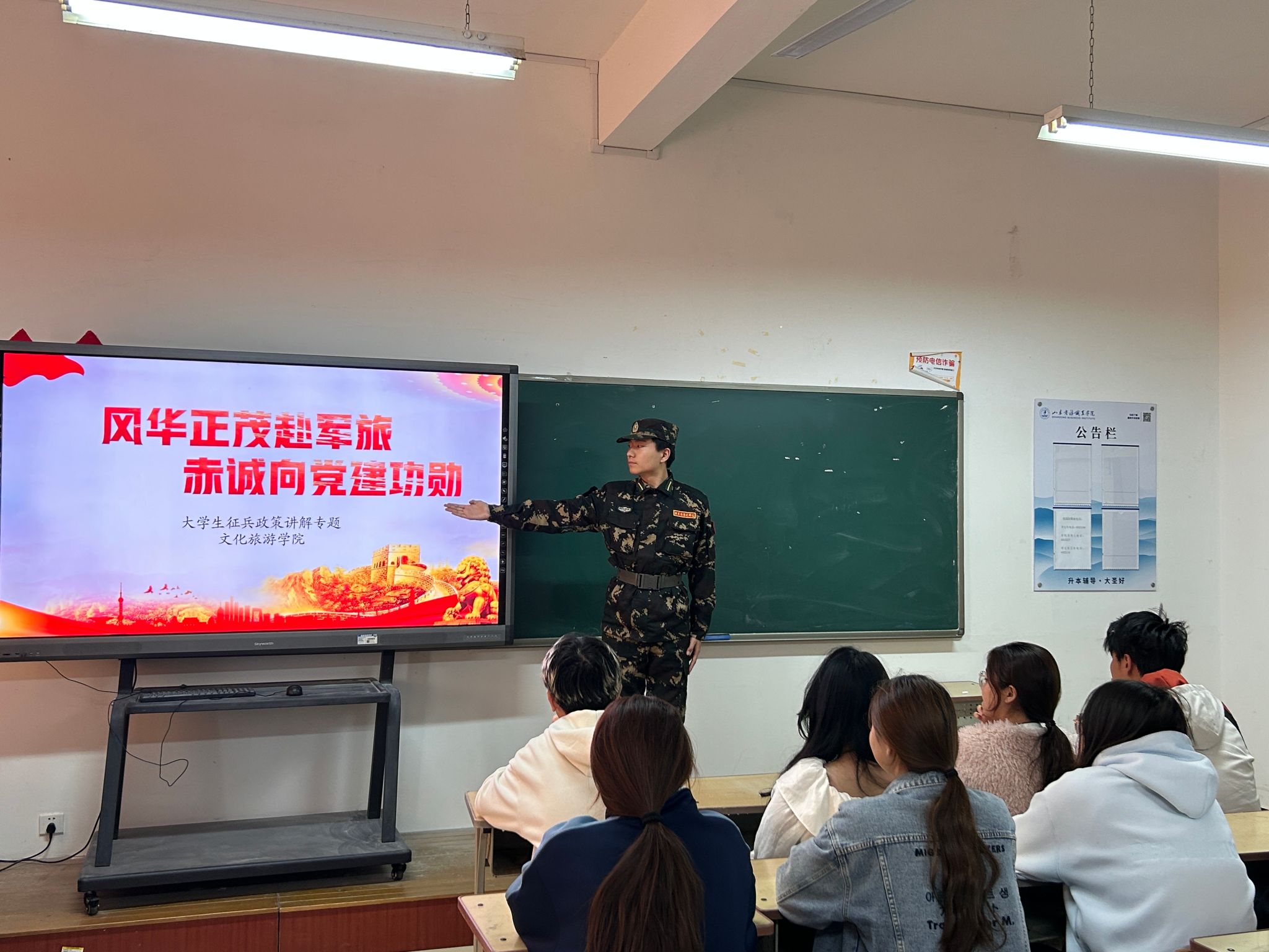 研策引航,筑牢信念根基。学院紧密结合征兵季关键节点,充分利用线上线下双平台,线上通过专题推送实时更新政策动态,线下举办专题讲座进行深度解读,对大学生参军入伍所享有的优先优待政策、国家资助体系、部队职业发展路径,以及退役后的复学升学、就业创业扶持等福利进行全方位、多角度地阐释。这种精准“滴灌”式的政策宣传,极大地增强了文旅学子投身国防的信心与决心。