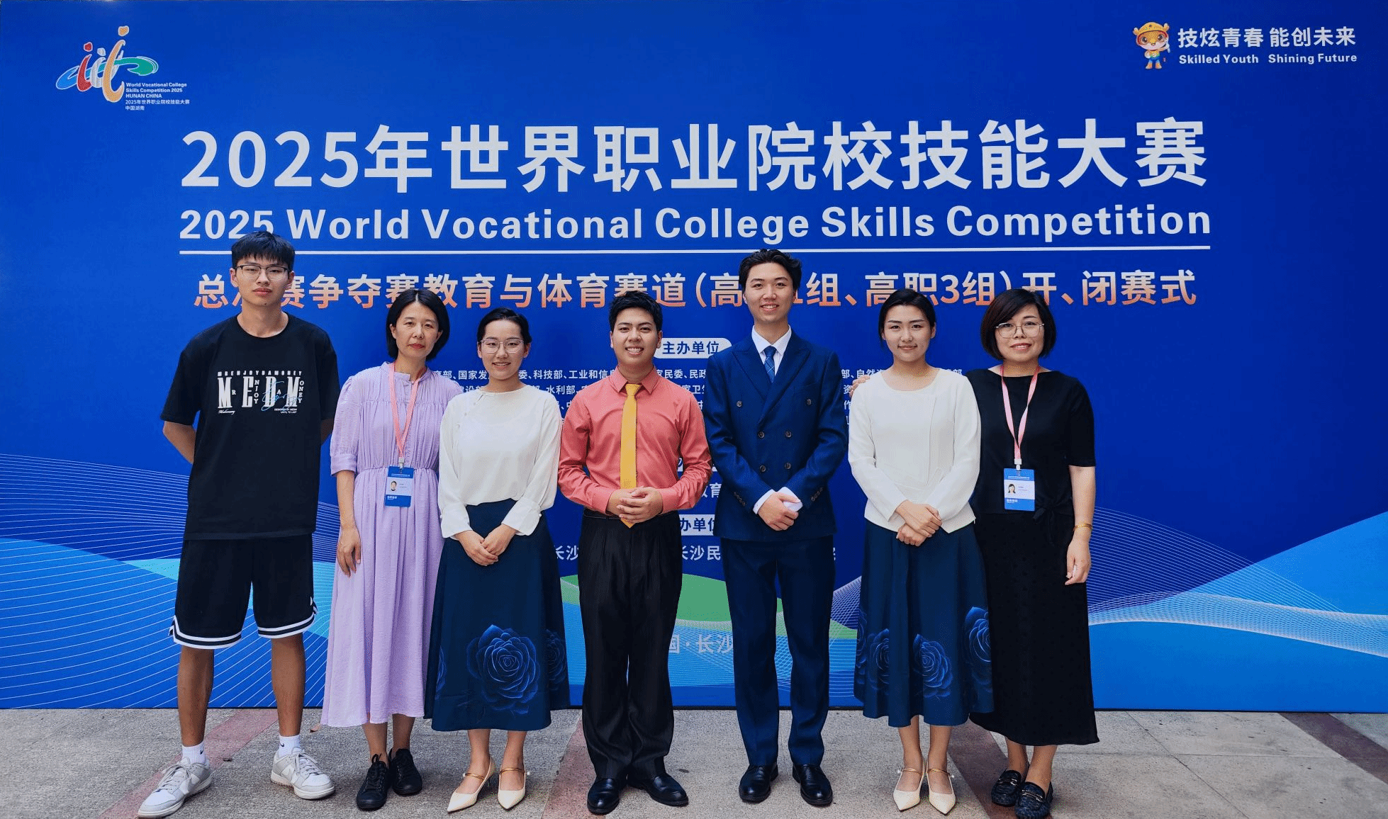 本站讯 8月27日至31日,2025年世界职业院校技能大赛总决赛争夺赛教育与体育赛道在长沙民政职业学院举行,来自全国各省、市、自治区的169支参赛队伍参加了此次比赛。由我校学生汤子豪、张亚拿、何晴晴、胡红雷组成的代表队,凭借出色的表现,以扎实的专业能力、创新的项目设计和自信从容的现场发挥,一举夺得该赛道金奖,刷新了我校在该项赛事中的历史最好成绩。