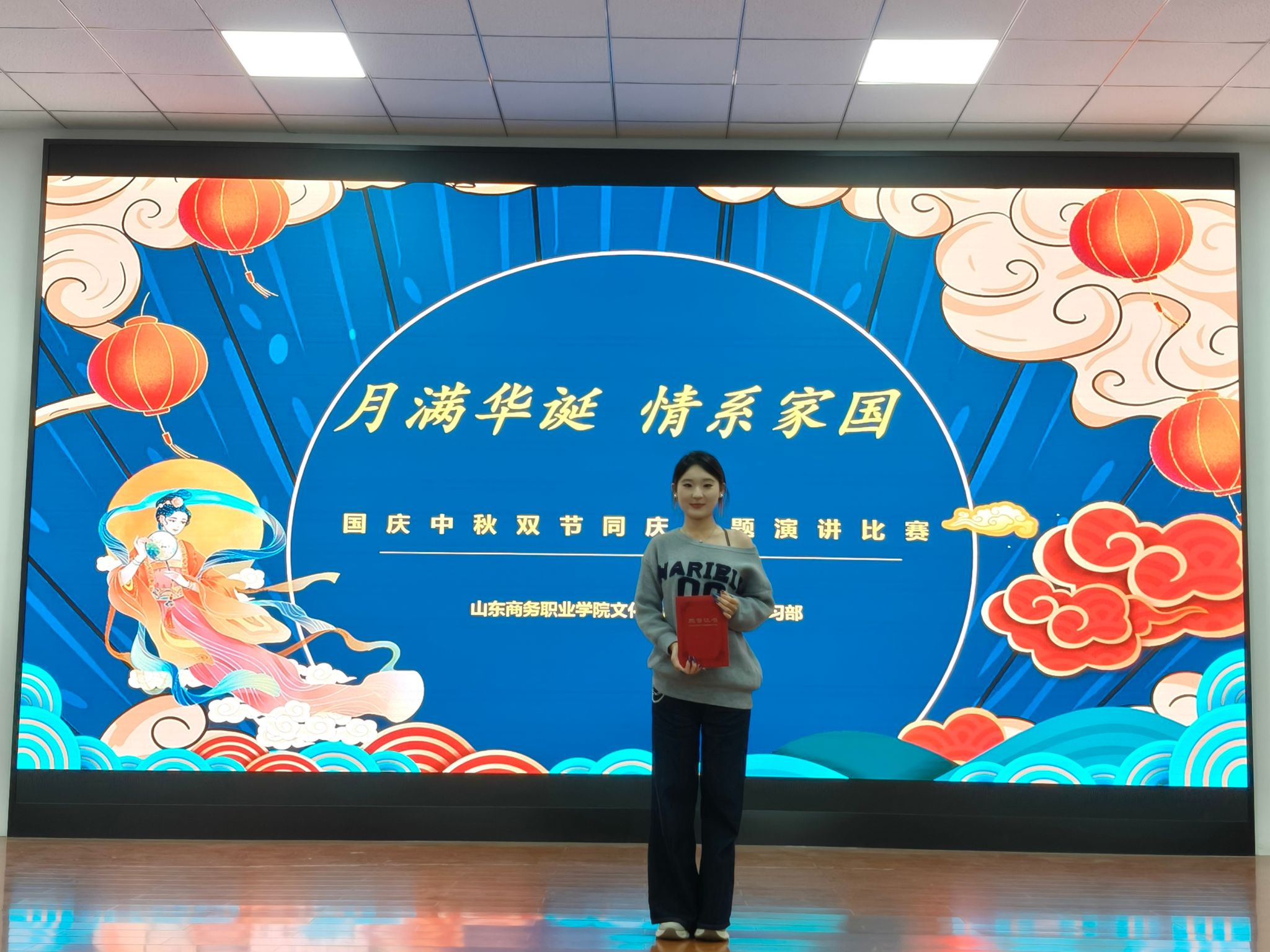 活动中,选手们用一段段声情并茂的讲述,一句句铿锵有力的誓言,将个人理想、家庭幸福与国家命运紧密相连,深刻诠释了“小家”团圆与“大家”昌盛之间的血脉联系。他们富有感染力的表现,一次次打动了现场的评委和观众。经过近两个小时的激烈角逐,大赛评出一等奖一名,25英2班莫咏轩;二等奖两名,25托4班王姿婷、24学2班陈卓杰;三等奖三名,25旅1班陈明月、25学1班徐婧琪、24酒1班朱逸然。获奖作品主题鲜明、内容丰富、情感真挚,既有对祖国历史的回顾,又有对未来的展望,充分展现了当代青年学子的爱国情怀和责任担当。