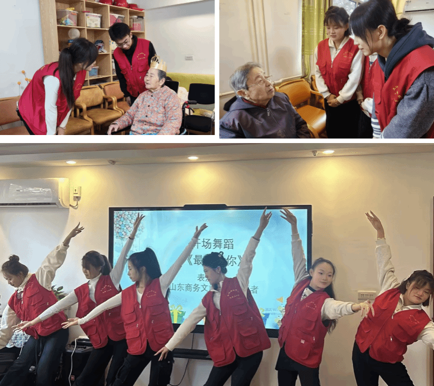 活动当日,文旅学子们早早抵达颐养院,迅速投入场地布置工作。大家分工明确,有的负责悬挂装饰,有的摆放桌椅,很快将活动现场装点得温馨舒适,营造出浓厚的庆祝氛围。生日会现场,文旅学子们缓缓推上精美的生日蛋糕,在熟悉的《生日快乐歌》旋律中,全场人员齐声高歌。温暖的烛光映照下,老人们双手合十,默默许下心愿,脸上洋溢着幸福与满足。除切蛋糕、送祝福等传统环节外,学子们还精心准备了精彩的文艺表演。歌曲《沂蒙山小调》旋律悠扬,舞蹈《最美是你》优美灵动,这些节目引发了老人们的强烈共鸣。他们或轻声跟唱,或用掌声打拍子,现场气氛热烈而融洽。