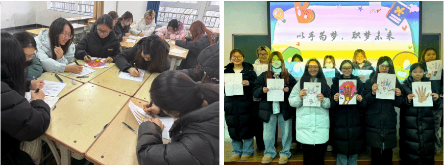活动通过独具特色的“手掌规划图”形式,引导学生系统梳理职业目标,搭建从校园到职场的认知桥梁。活动现场,同学们在纸上描绘出手掌轮廓,以掌心为梦想起点,写下心仪职业。五指分别代表职业规划的五个关键维度:大拇指,标注对目标行业的全面认知;食指,明确岗位所需的核心能力;中指,规划职业发展路径;无名指,盘点个人竞争优势;小拇指,制定具体的行动计划。通过自己的“手掌规划图”同学们发现问题并交流心得。24级托育3班陈可欣同学表示,“这个活动让我对婴幼儿发展指导师这个岗位有了系统认识,明确了需要考取高级育婴师证书和实习方向”。25级应用英语1班的高银鸽同学补充道,“通过对比岗位要求和个人优势,我发现了自己在社交礼仪上存在短板,确定了今后的努力方向”。