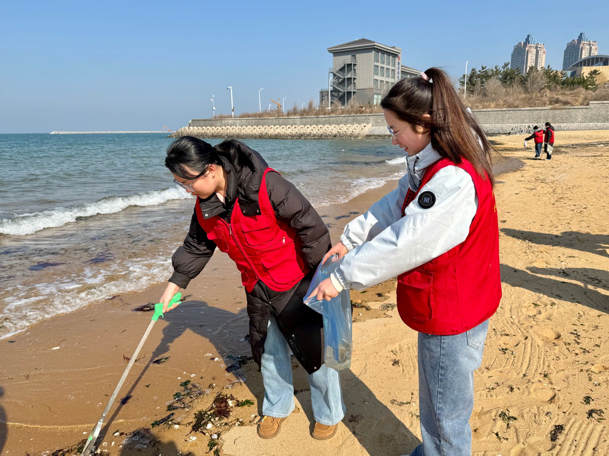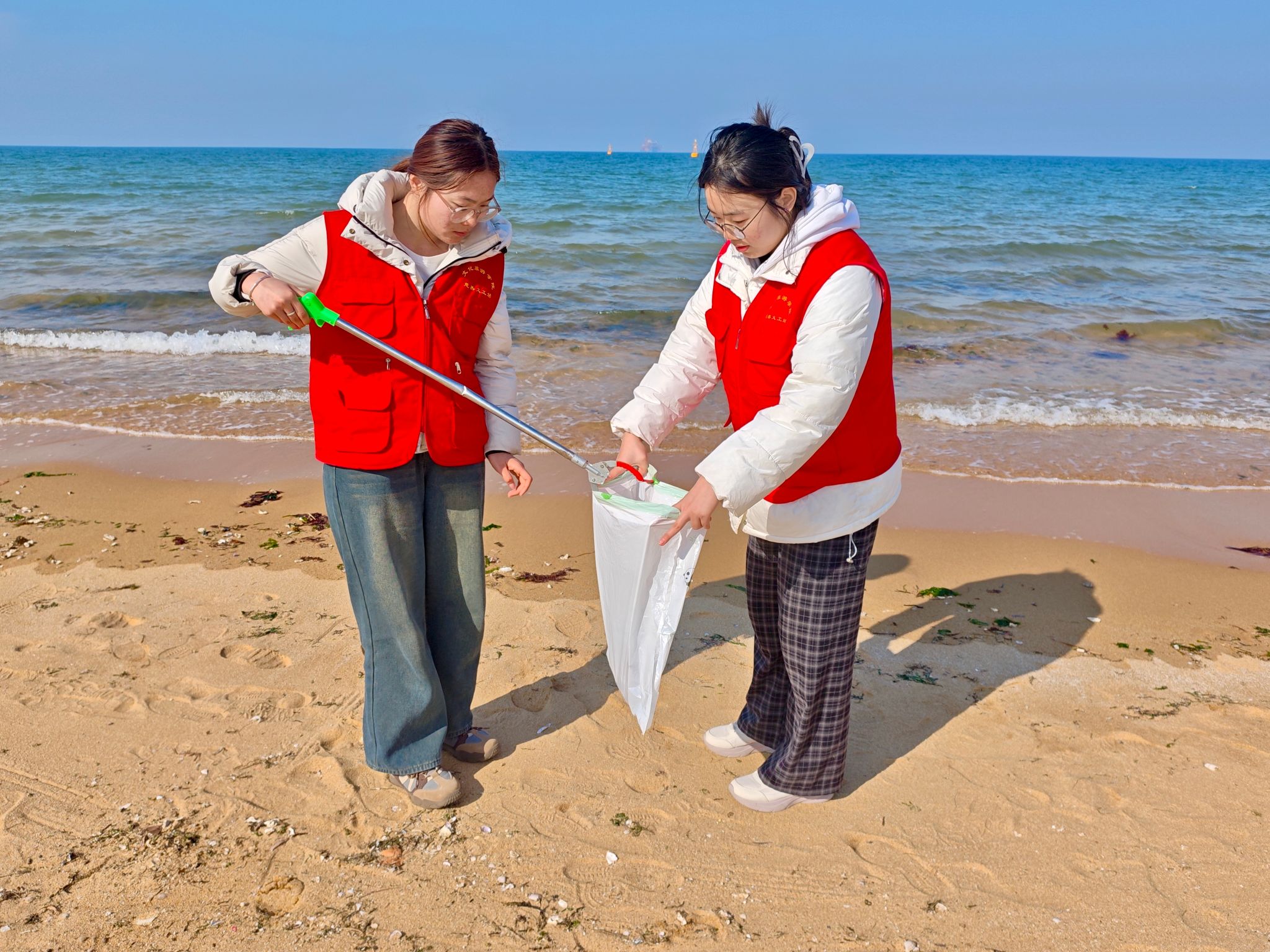 活动现场,志愿者们身着志愿服装,手持垃圾袋、垃圾夹等清洁工具,认真清理沙滩上的塑料瓶、食品包装袋、烟头、泡沫碎屑等各类垃圾。他们不怕脏、不怕累,弯腰捡拾的身影成为春日海岸一道亮丽的风景线。志愿者们不仅用勤劳的双手还原了海岸的洁净与美丽,更以实际行动践行了环保理念,让雷锋精神融入日常、化作经常。24级应用英语1班赵慧杰说:“在我们的努力下沙滩变得更加干净整洁,我感到无比自豪。以后我会更加积极地参与志愿服务活动,用自己的行动影响身边的人。”